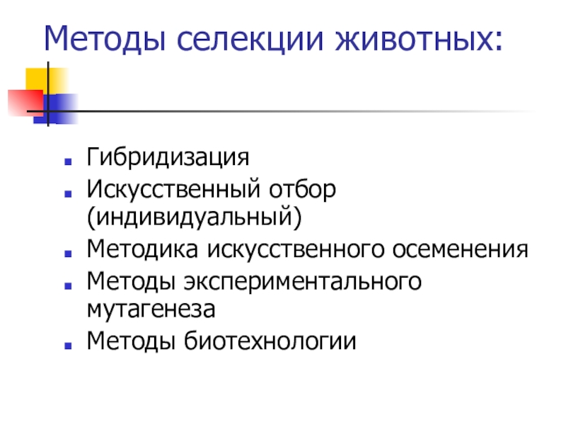Методы селекции животных:ГибридизацияИскусственный отбор (индивидуальный)Методика искусственного осемененияМетоды экспериментального мутагенезаМетоды биотехнологии