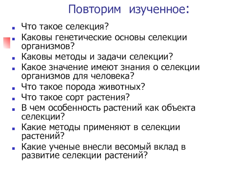 Повторим изученное:Что такое селекция?Каковы генетические основы селекции организмов?Каковы методы и задачи селекции?Какое значение имеют знания о селекции организмов для человека?Что такое порода животных?Что такое сорт растения?В чем особенность растений как объекта селекции?Какие методы применяют в селекции