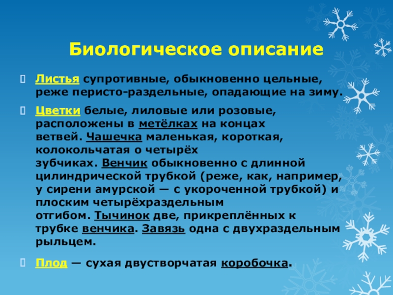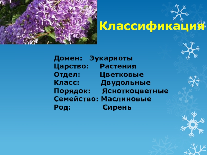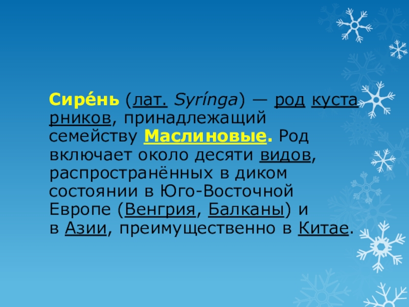 Слайд 2Сире́нь (лат. Syrínga) — род кустарников, принадлежащий семейству Маслиновые. Род включает около десяти видов, распространённых в диком состоянии