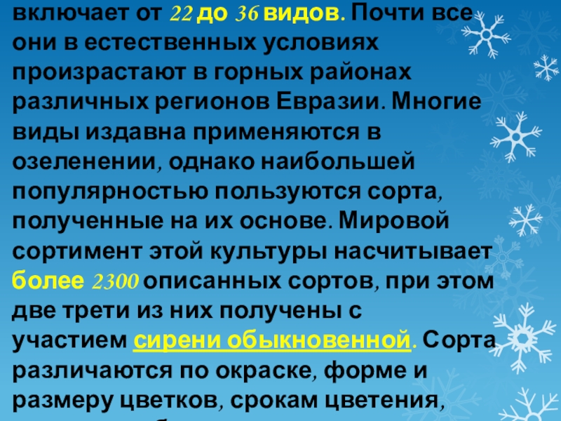 видов. Почти все они в естественных условиях произрастают в горных районах различных регионов Евразии. Многие виды издавна применяются в озеленении, однако наибольшей популярностью пользуются сорта, полученные на их основе. Мировой сортимент этой культуры насчитывает более 2300 описанных сортов, при этом две трети из них получены с участием сирени обыкновенной. Сорта различаются по окраске, форме и размеру цветков, срокам цветения, высоте и габитусу кустов и т. д.