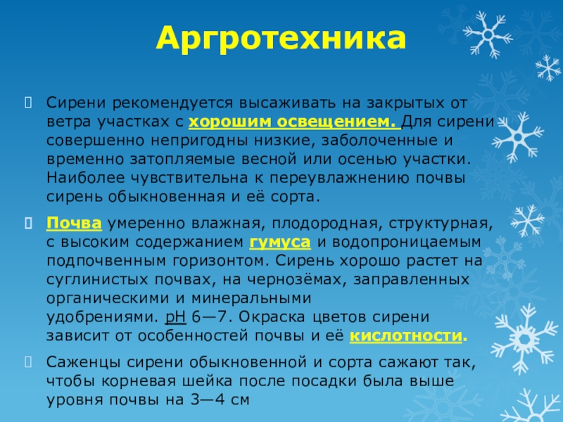 Аргротехника Сирени рекомендуется высаживать на закрытых от ветра участках с хорошим освещением. Для сирени совершенно непригодны низкие,