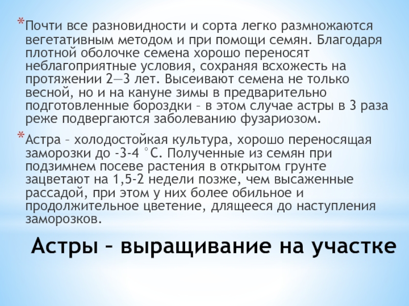 вегетативным методом и при помощи семян. Благодаря плотной оболочке семена хорошо переносят неблагоприятные условия, сохраняя всхожесть на протяжении 2—3 лет. Высеивают семена не только весной, но и на кануне зимы в предварительно подготовленные бороздки – в этом случае астры в 3 раза реже подвергаются заболеванию фузариозом.
