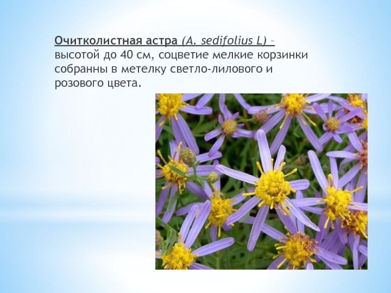Слайд 30Очитколистная астра (A. sedifolius L) – высотой до 40 см, соцветие мелкие корзинки