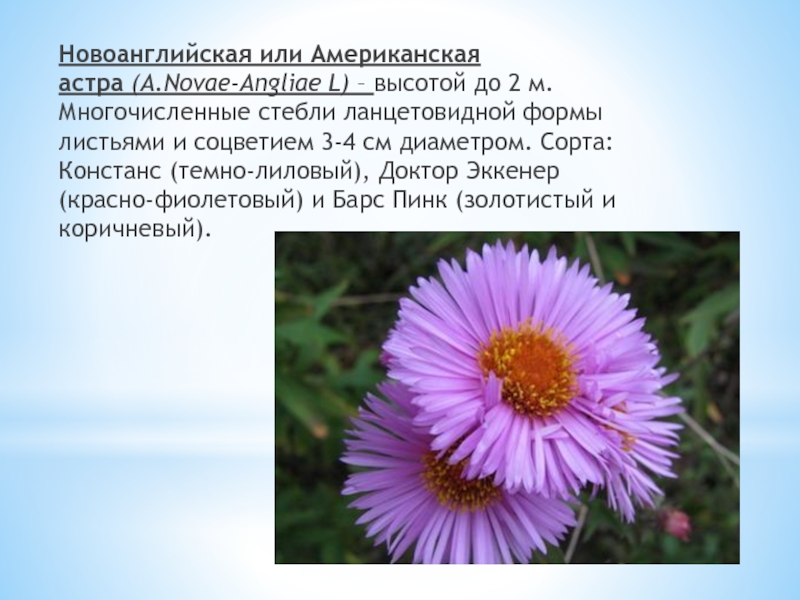 Слайд 28Новоанглийская или Американская астра (A.Novae-Angliae L) – высотой до 2 м. Многочисленные стебли