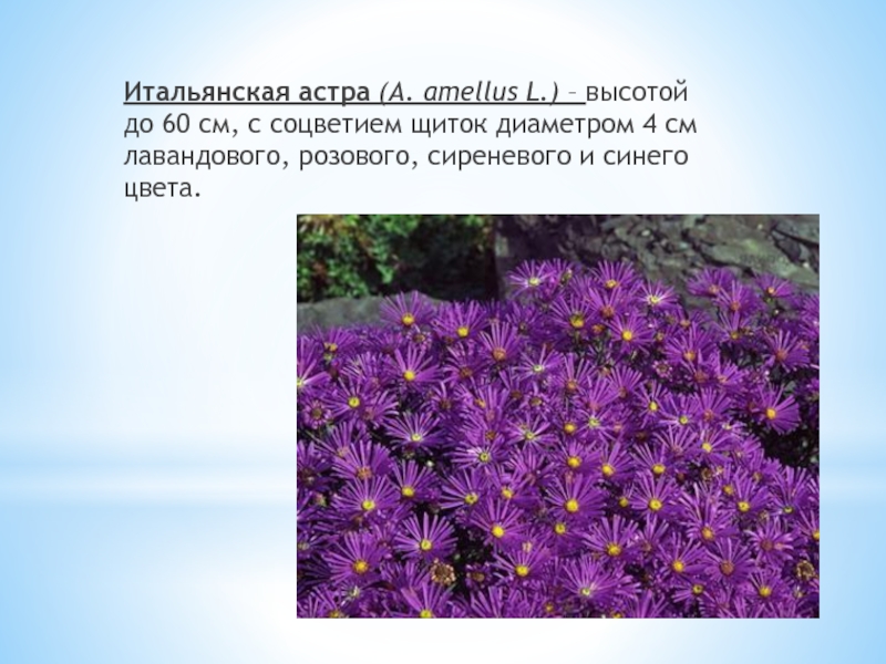 Слайд 31Итальянская астра (A. amellus L.) – высотой до 60 см, с соцветием щиток