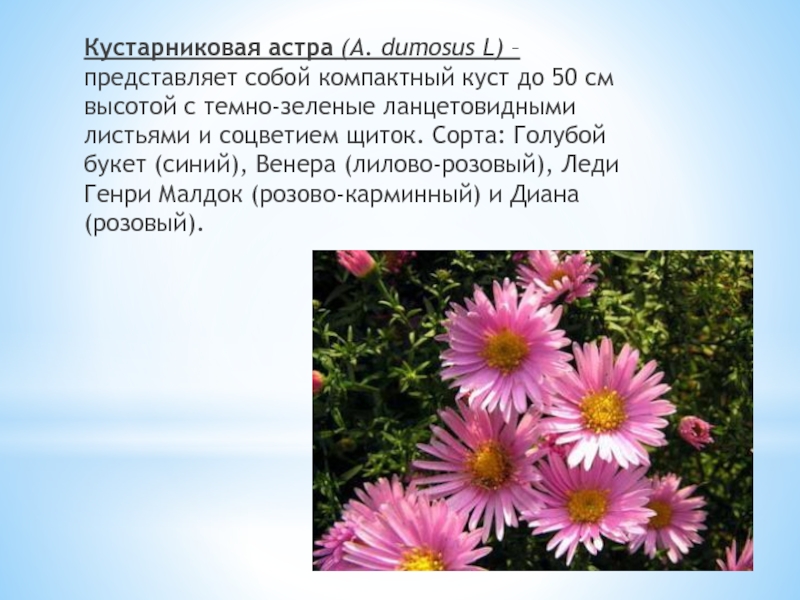 Слайд 29Кустарниковая астра (A. dumosus L) – представляет собой компактный куст до 50 см