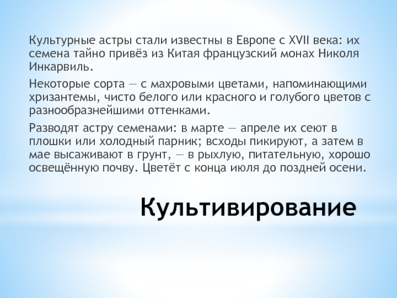 Разводят астру семенами: в марте — апреле их сеют в плошки или холодный парник; всходы пикируют, а затем в мае высаживают в грунт, — в рыхлую, питательную, хорошо освещённую почву. Цветёт с конца июля до поздней осени.