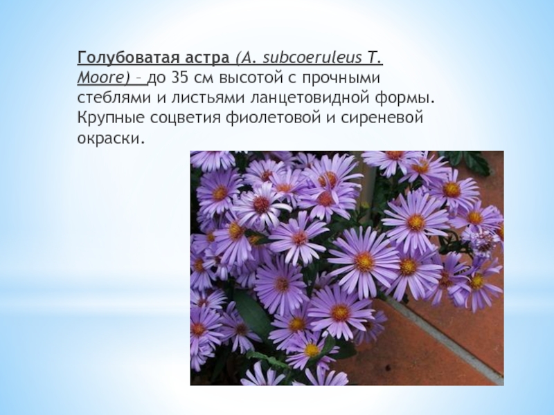 Слайд 32Голубоватая астра (A. subcoeruleus T. Moore) – до 35 см высотой с прочными
