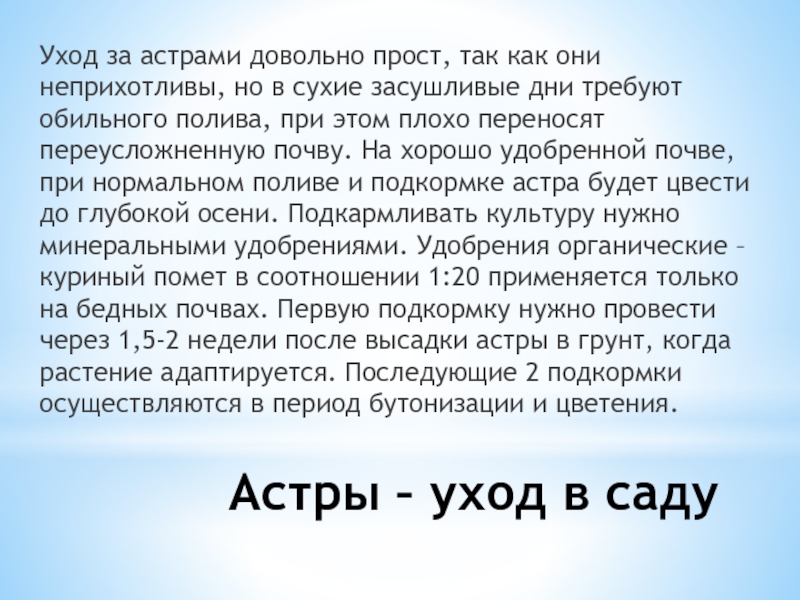 как они неприхотливы, но в сухие засушливые дни требуют обильного полива, при этом плохо переносят переусложненную почву. На хорошо удобренной почве, при нормальном поливе и подкормке астра будет цвести до глубокой осени. Подкармливать культуру нужно минеральными удобрениями. Удобрения органические – куриный помет в соотношении 1:20 применяется только на бедных почвах. Первую подкормку нужно провести через 1,5-2 недели после высадки астры в грунт, когда растение адаптируется. Последующие 2 подкормки осуществляются в период бутонизации и цветения.