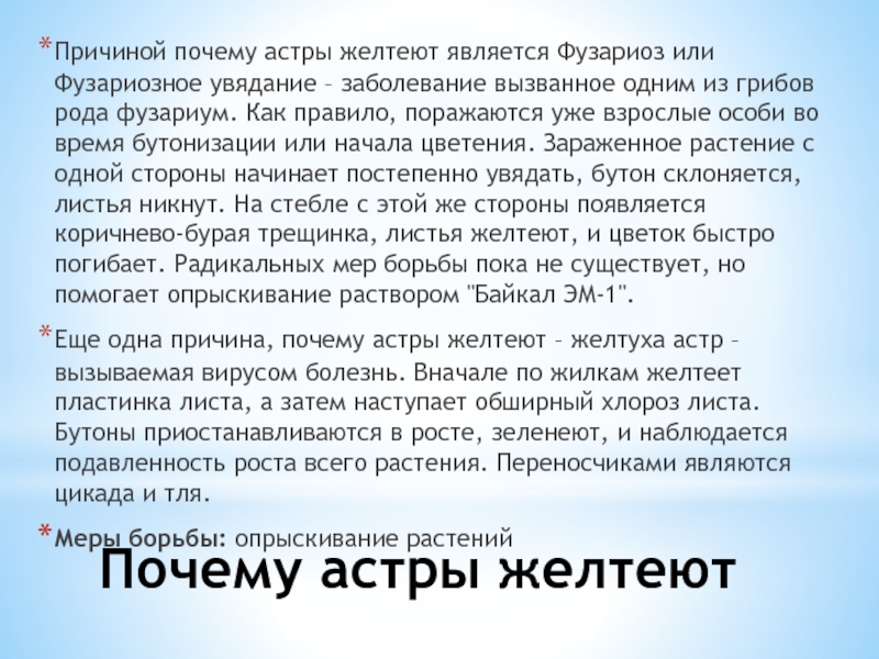 Причиной почему астры желтеют является Фузариоз или Фузариозное увядание