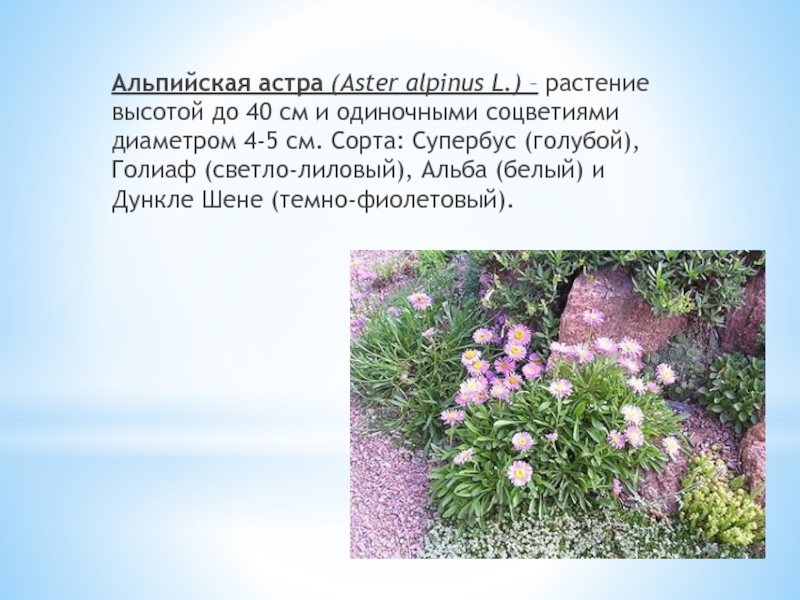 Слайд 33Альпийская астра (Aster alpinus L.) – растение высотой до 40 см и одиночными