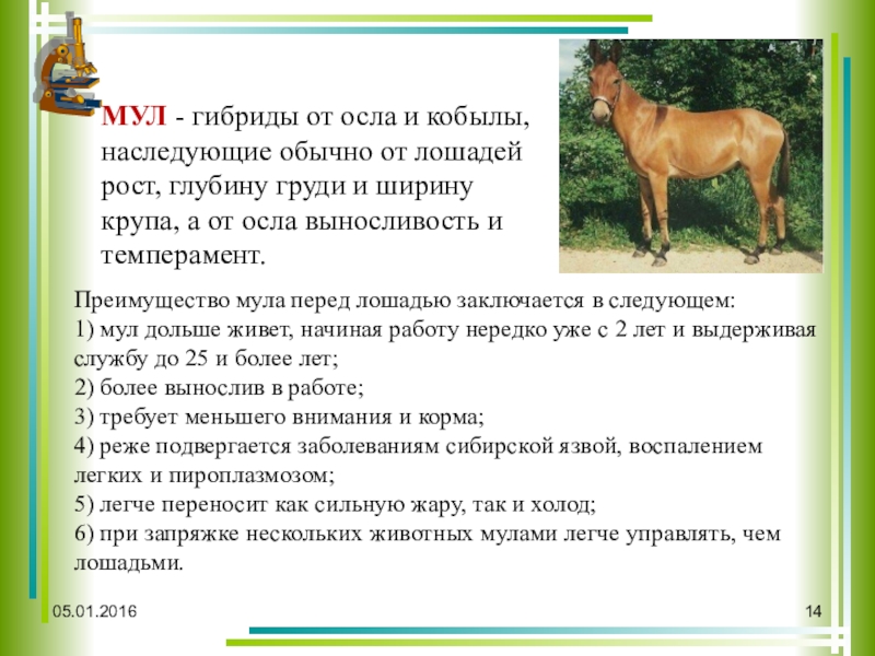 1) мул дольше живет, начиная работу нередко уже с 2 лет и выдерживая службу до 25 и более лет;