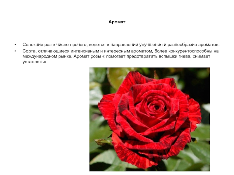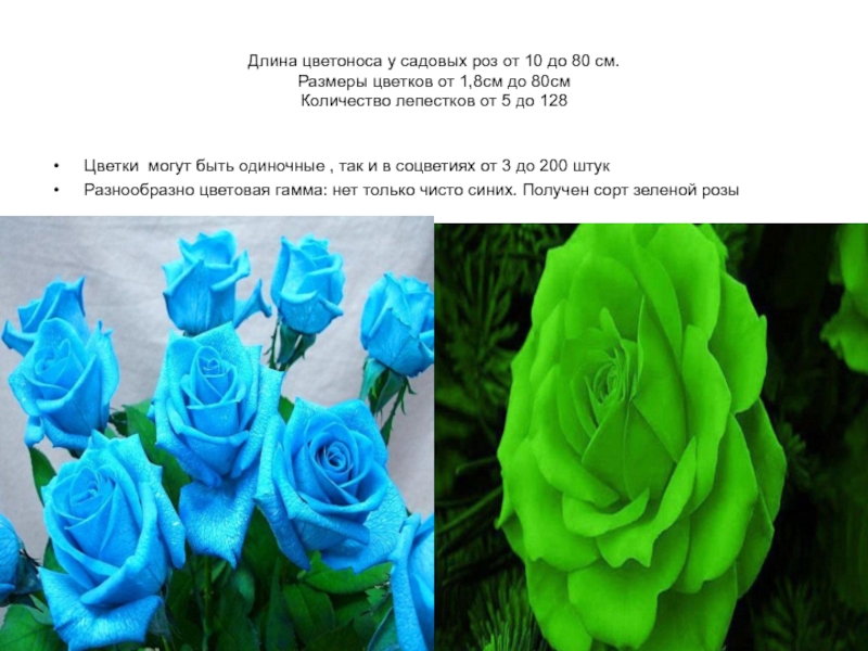 Разнообразно цветовая гамма: нет только чисто синих. Получен сорт зеленой розы