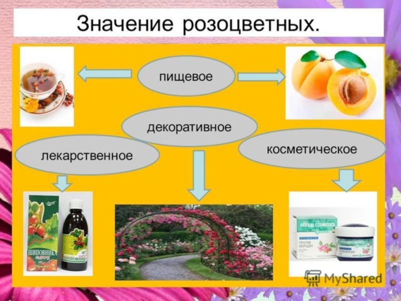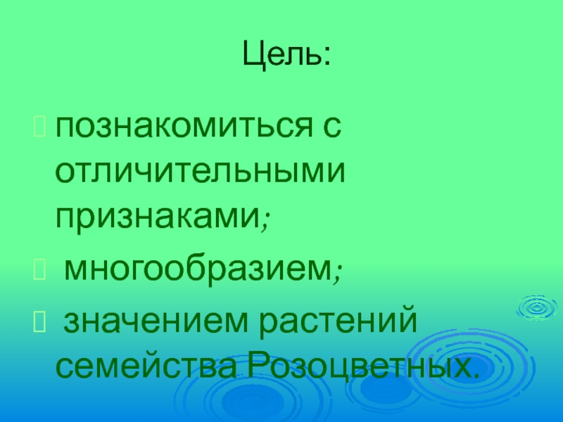 Цель:познакомиться с отличительными признаками; многообразием; значением растений семейства Розоцветных.