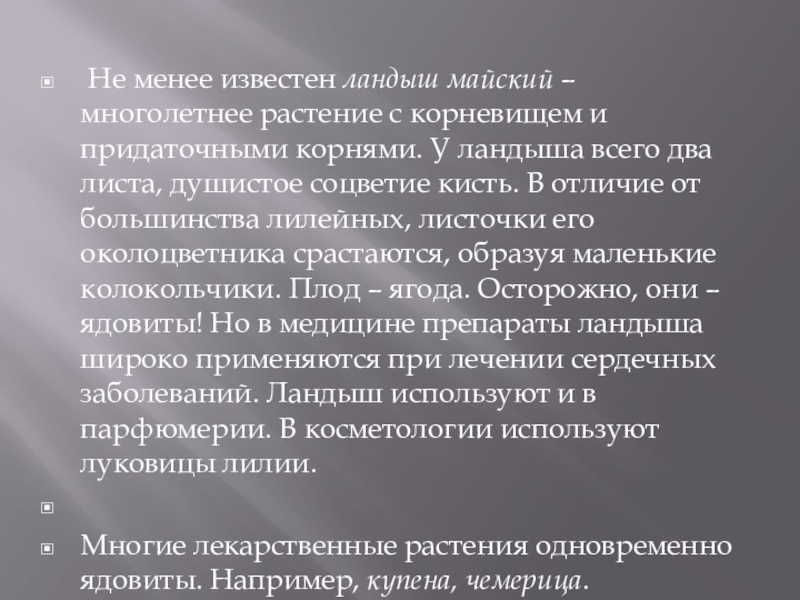 корнями. У ландыша всего два листа, душистое соцветие кисть. В отличие от большинства лилейных, листочки его околоцветника срастаются, образуя маленькие колокольчики. Плод – ягода. Осторожно, они – ядовиты! Но в медицине препараты ландыша широко применяются при лечении сердечных заболеваний. Ландыш используют и в парфюмерии. В косметологии используют луковицы лилии.