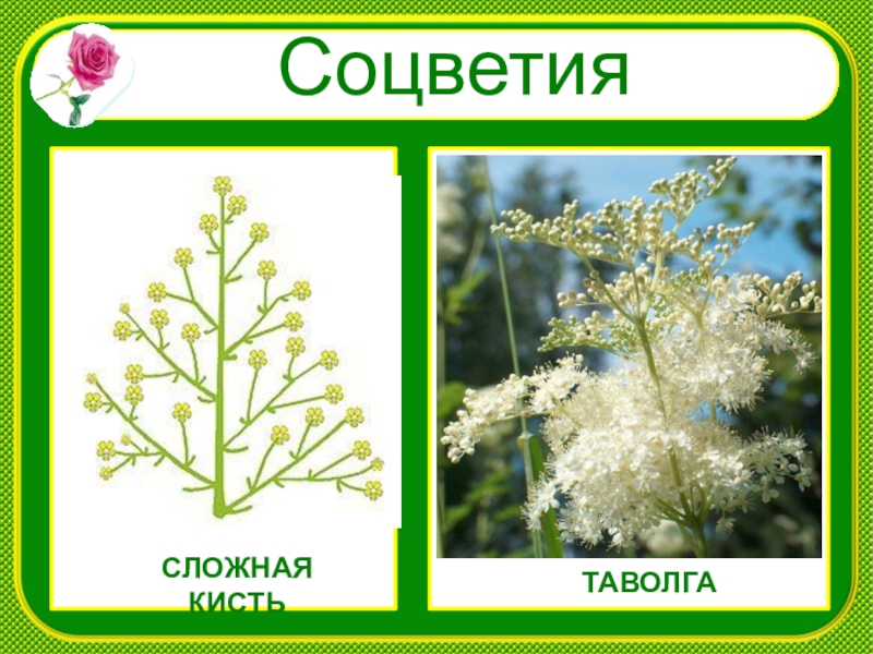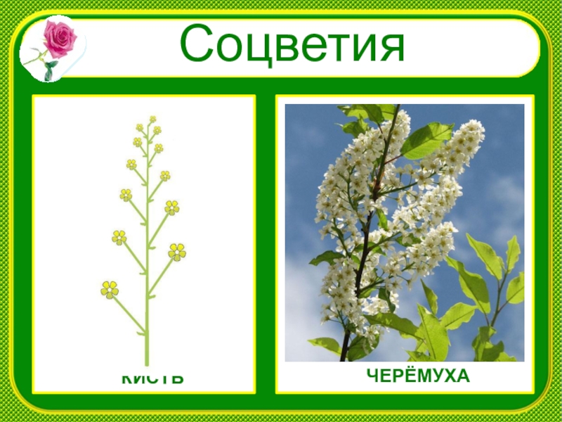 Цветки розоцветных — одиночные (роза) или собраны в соцветия (кисть у черемухи, щиток у груши).