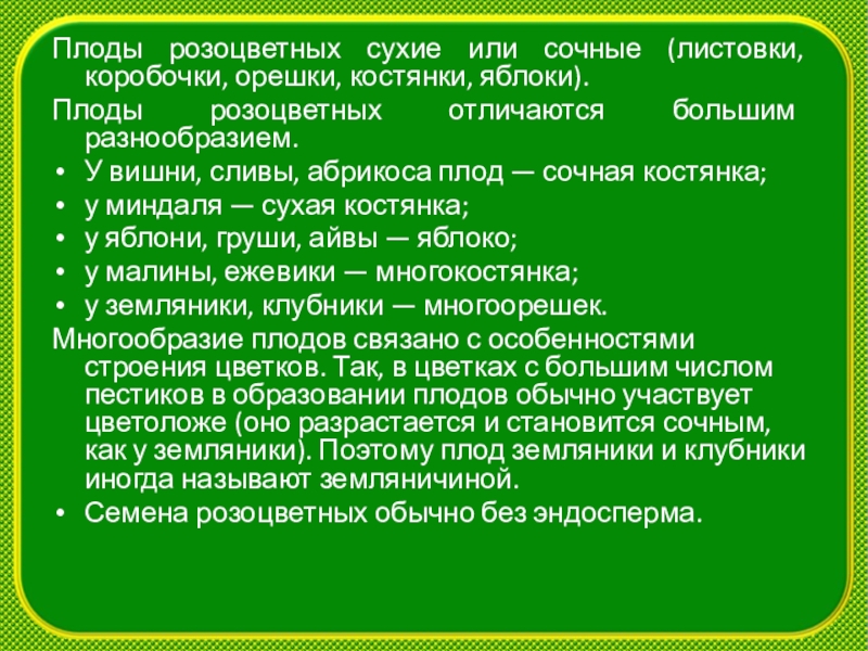 Слайд 13Плоды розоцветных сухие или сочные (листовки, коробочки, орешки, костянки, яблоки).