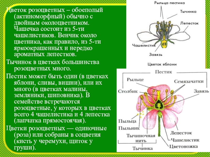 Слайд 6Цветок розоцветных – обоеполый (актиноморфный) обычно с двойным околоцветником. Чашечка состоит