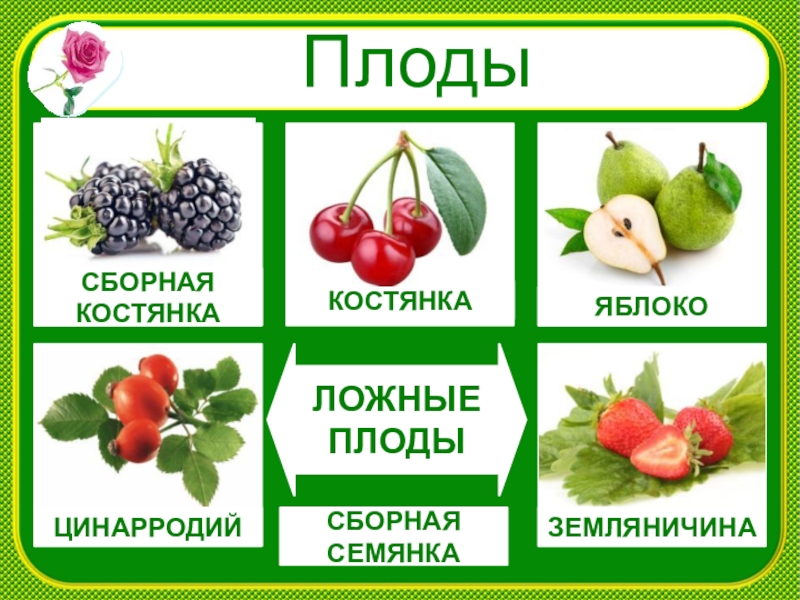 Многообразие плодов связано с особенностями строения цветков. Так, в цветках с большим числом пестиков в образовании плодов обычно участвует цветоложе (оно разрастается и становится сочным, как у земляники). Поэтому плод земляники и клубники иногда называют земляничиной.