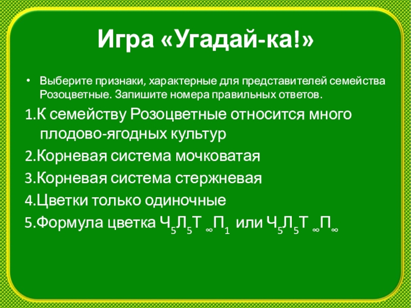 Выберите признаки, характерные для представителей семейства Розоцветные. Запишите номера правильных