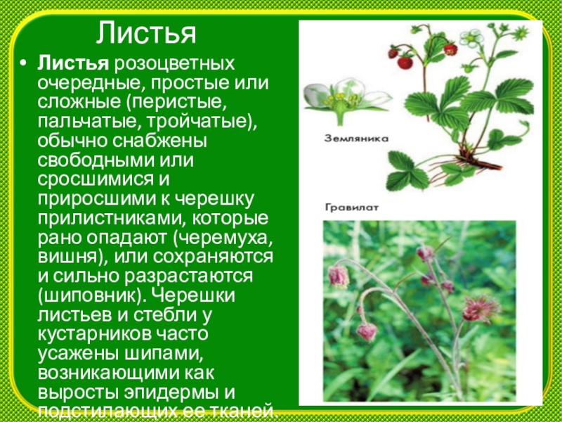 Листья розоцветных очередные, простые или сложные (перистые, пальчатые, тройчатые), обычно снабжены