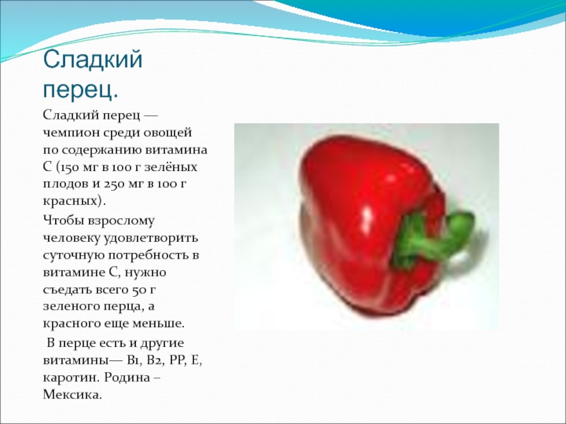 В перце есть и другие витамины— В1, В2, РР, Е, каротин. Родина – Мексика.