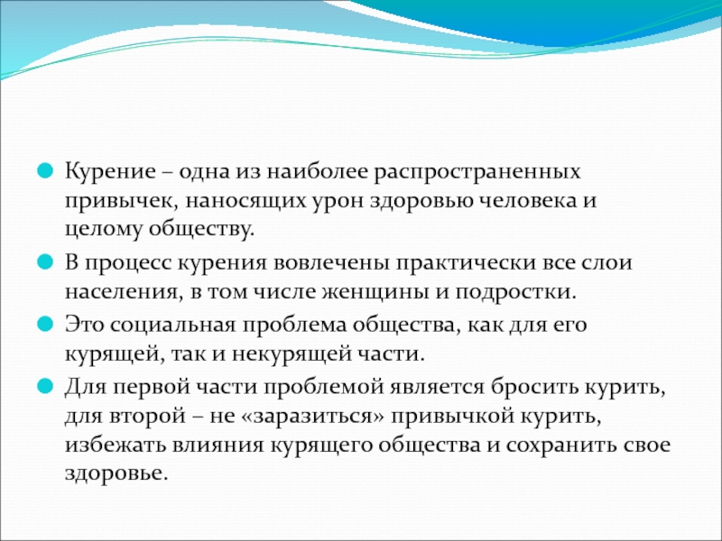 Для первой части проблемой является бросить курить, для второй – не «заразиться» привычкой курить, избежать влияния курящего общества и сохранить свое здоровье.