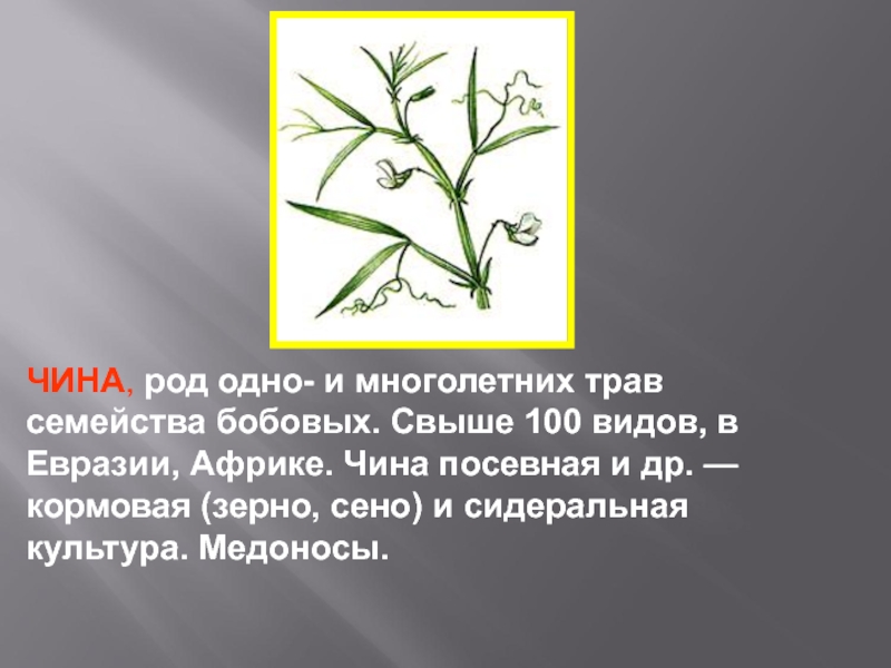 Слайд 17ЧИНА, род одно- и многолетних трав семейства бобовых. Свыше 100 видов,