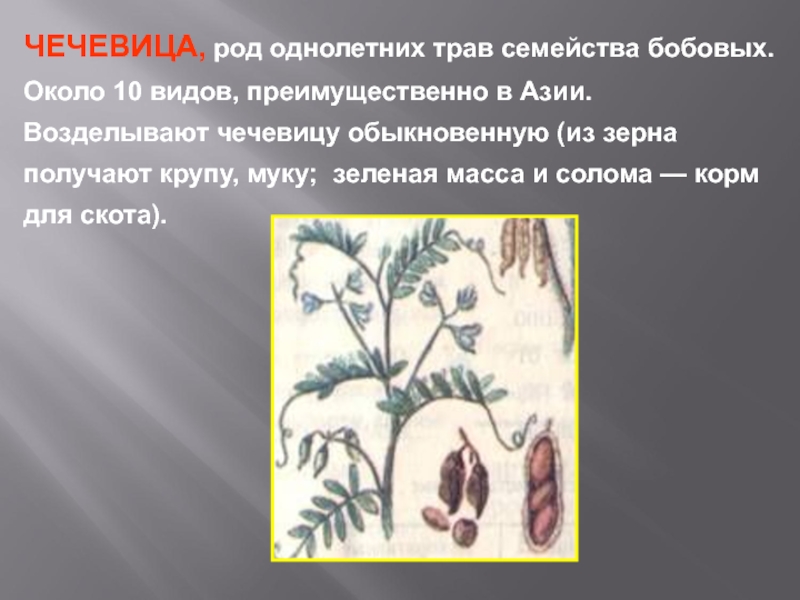 Слайд 14ЧЕЧЕВИЦА, род однолетних трав семейства бобовых. Около 10 видов, преимущественно в