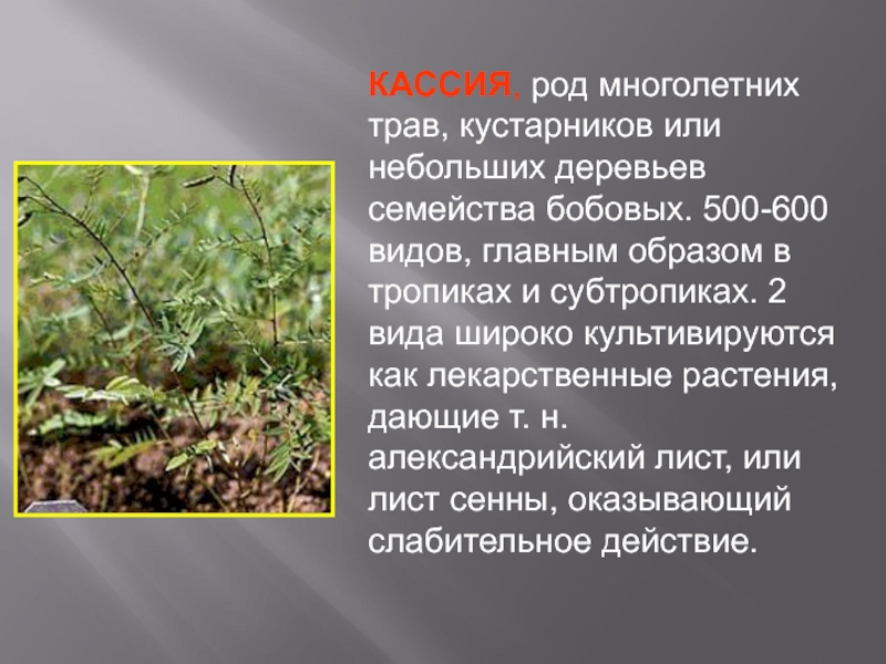 Слайд 33КАССИЯ, род многолетних трав, кустарников или небольших деревьев семейства бобовых. 500-600
