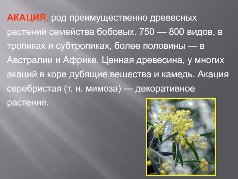 Слайд 35АКАЦИЯ, род преимущественно древесных растений семейства бобовых. 750 — 800 видов,