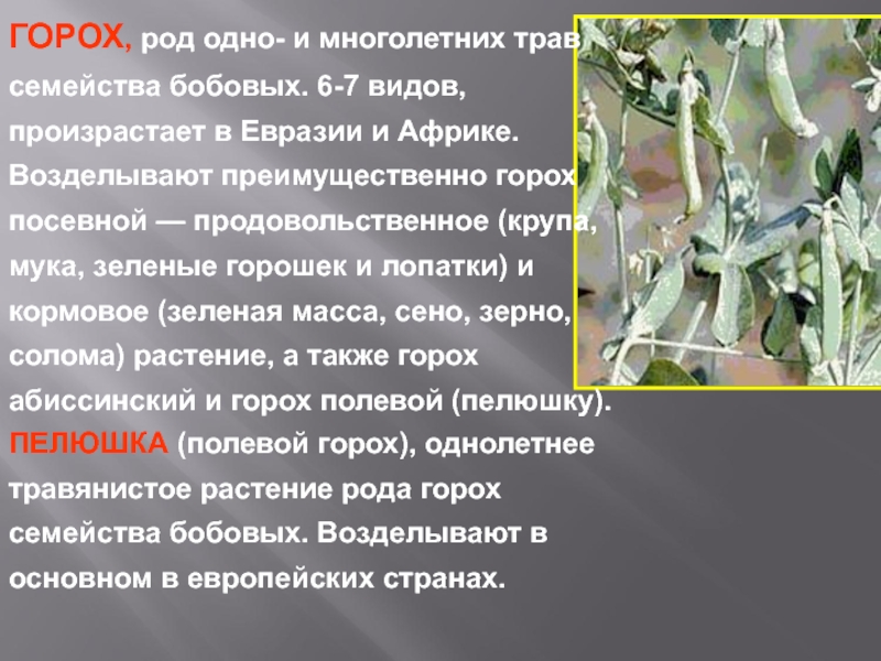 Слайд 10ПЕЛЮШКА (полевой горох), однолетнее травянистое растение рода горох семейства бобовых. Возделывают