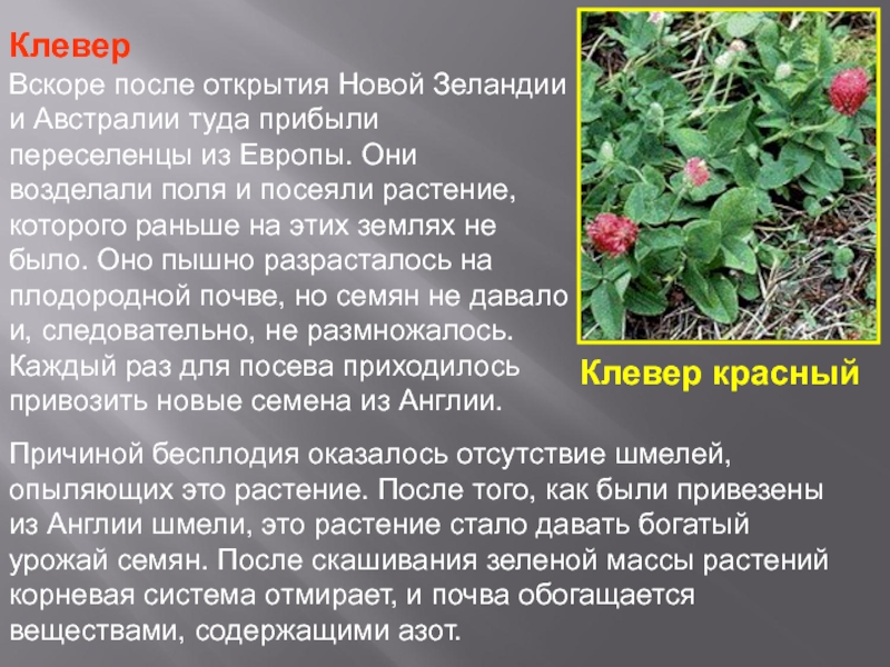 Вскоре после открытия Новой Зеландии и Австралии туда прибыли переселенцы из Европы. Они возделали поля и посеяли растение, которого раньше на этих землях не было. Оно пышно разрасталось на плодородной почве, но семян не давало и, следовательно, не размножалось. Каждый раз для посева приходилось привозить новые семена из Англии.
