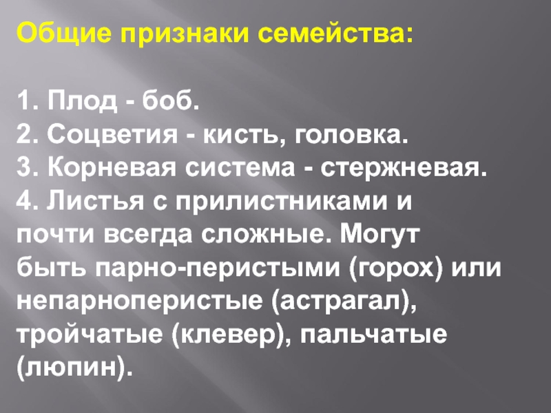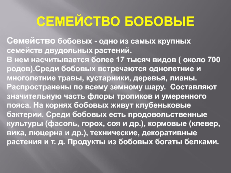 нем насчитывается более 17 тысяч видов ( около 700 родов).Среди бобовых встречаются однолетние и многолетние травы, кустарники, деревья, лианы. Распространены по всему земному шару. Составляют значительную часть флоры тропиков и умеренного пояса. На корнях бобовых живут клубеньковые бактерии. Среди бобовых есть продовольственные культуры (фасоль, горох, соя и др.), кормовые (клевер, вика, люцерна и др.), технические, декоративные растения и т. д. Продукты из бобовых богаты белками.