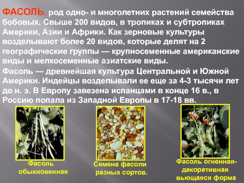 ФАСОЛЬ, род одно- и многолетних растений семейства бобовых. Свыше 200 видов, в тропиках и субтропиках Америки, Азии и Африки. Как зерновые культуры возделывают более 20 видов, которые делят на 2 географические группы — крупносеменные американские виды и мелкосеменные азиатские виды.