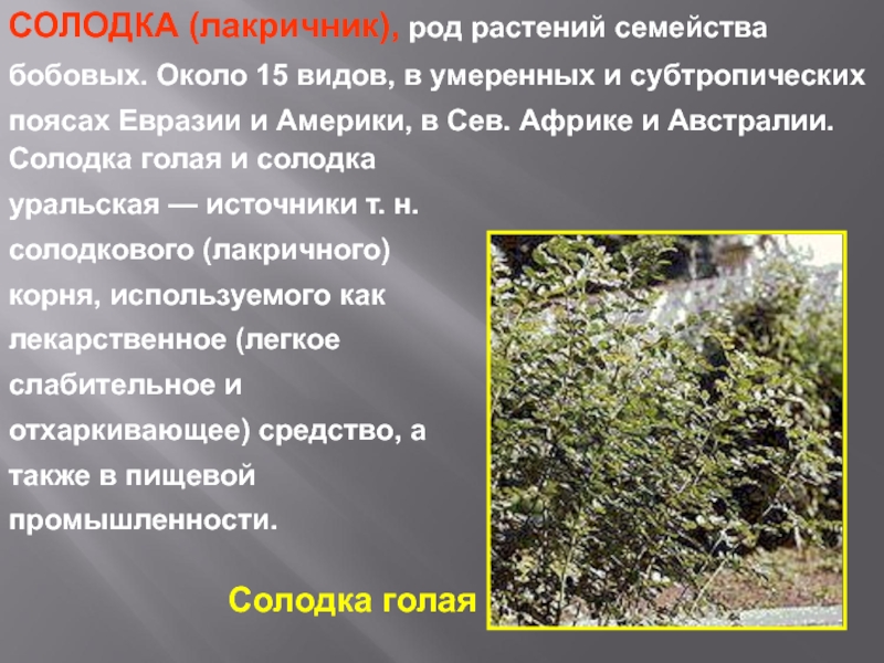 Слайд 28СОЛОДКА (лакричник), род растений семейства бобовых. Около 15 видов, в умеренных