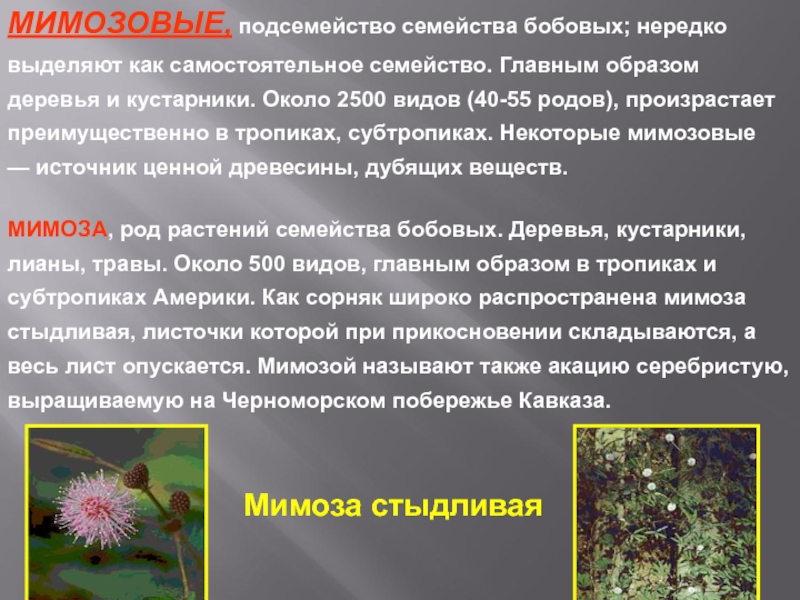 Слайд 34МИМОЗОВЫЕ, подсемейство семейства бобовых; нередко выделяют как самостоятельное семейство. Главным образом
