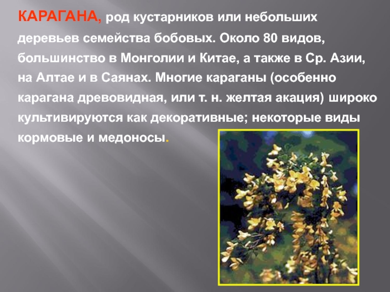 Слайд 24КАРАГАНА, род кустарников или небольших деревьев семейства бобовых. Около 80 видов,