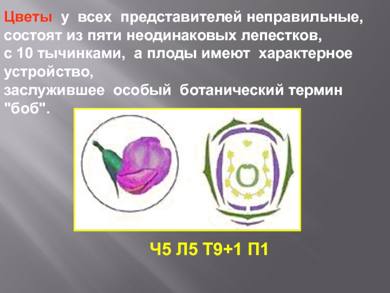 Слайд 7Цветы у всех представителей неправильные, состоят из пяти неодинаковых лепестков,