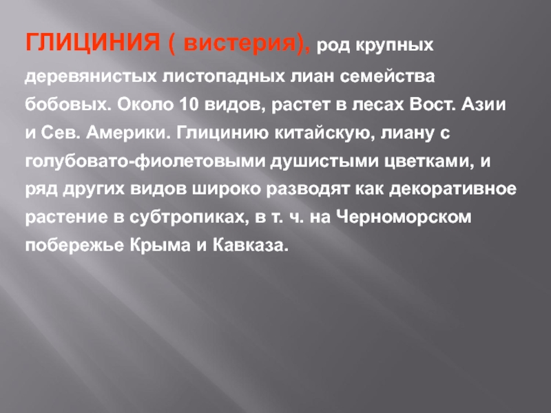 Слайд 25ГЛИЦИНИЯ ( вистерия), род крупных деревянистых листопадных лиан семейства бобовых. Около
