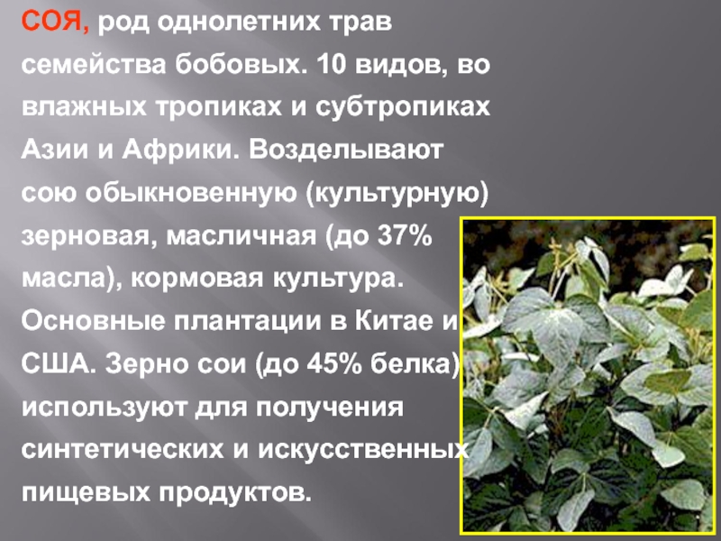 Слайд 13СОЯ, род однолетних трав семейства бобовых. 10 видов, во влажных тропиках