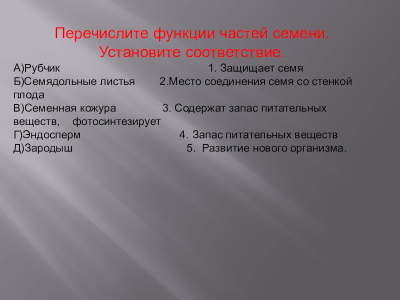 Слайд 6Перечислите функции частей семени. Установите соответствие.