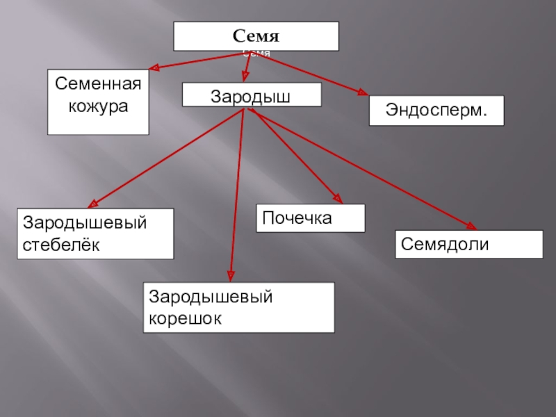 СемяСемяСеменная кожураЗародыш.Эндосперм.Зародышевый стебелёкЗародышевый корешокПочечкаСемядоли