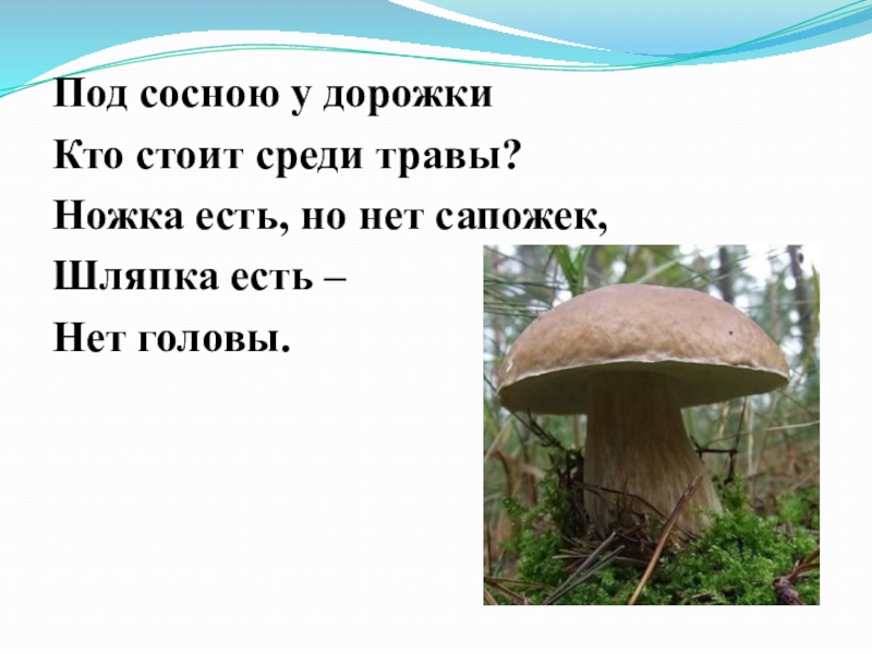 Под сосною у дорожкиКто стоит среди травы?Ножка есть, но нет сапожек,Шляпка есть – Нет головы.