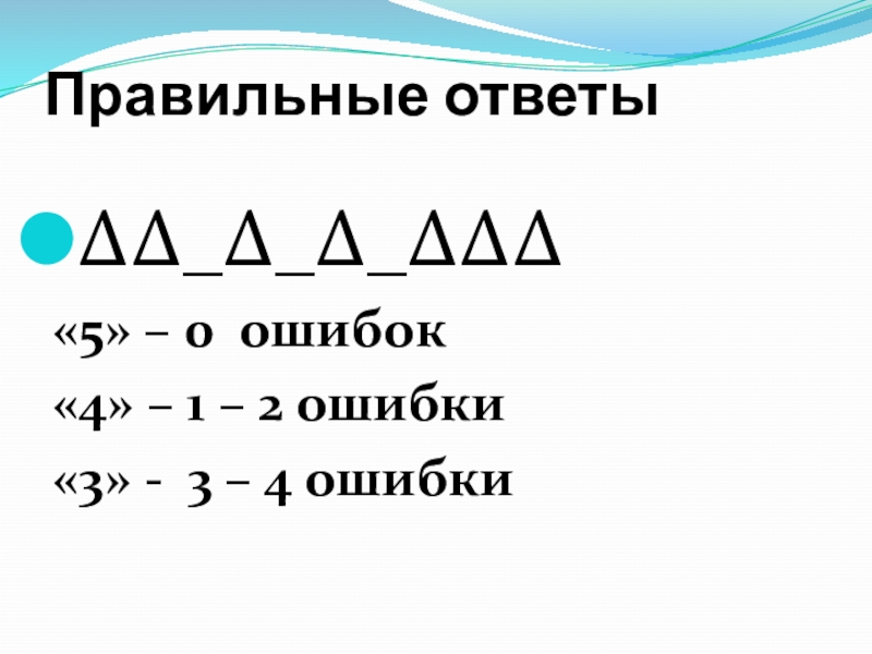 Правильные ответы∆∆_∆_∆_∆∆∆«5» – 0 ошибок«4» – 1 – 2 ошибки«3» - 3 – 4 ошибки