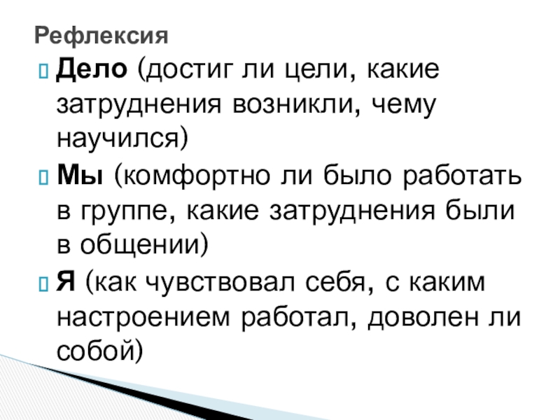 Дело (достиг ли цели, какие затруднения возникли, чему научился)Мы (комфортно ли было работать в группе, какие затруднения