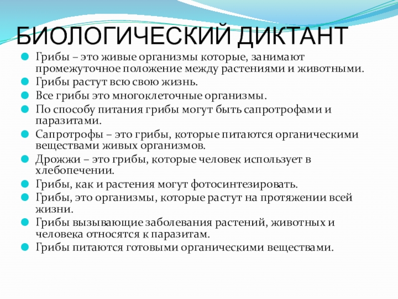 БИОЛОГИЧЕСКИЙ ДИКТАНТГрибы – это живые организмы которые, занимают промежуточное положение между растениями и животными.Грибы растут всю свою