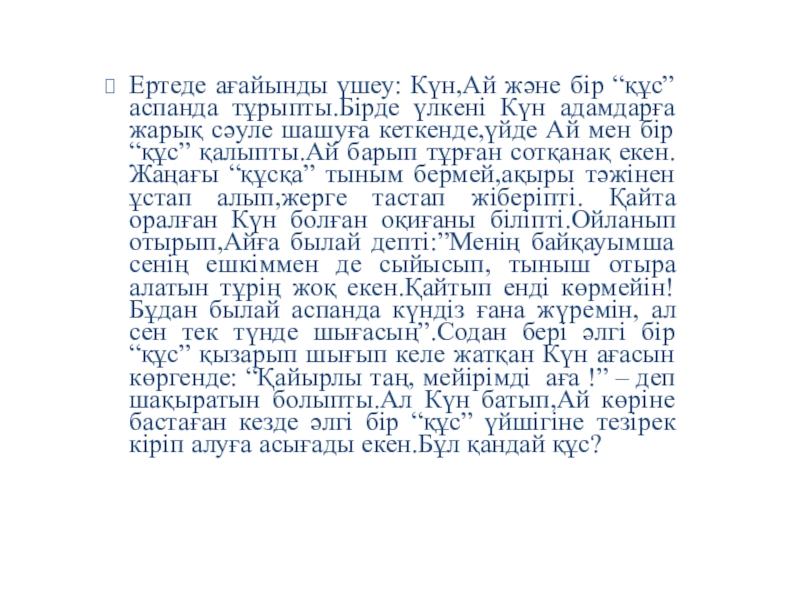Ертеде ағайынды үшеу: Күн,Ай және бір “құс” аспанда тұрыпты.Бірде үлкені Күн