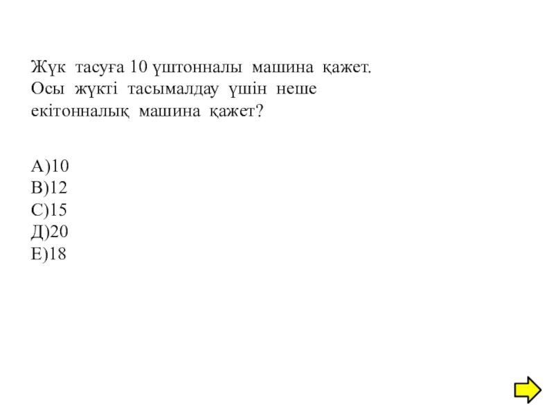Слайд 9Жүк тасуға 10 үштонналы машина қажет.