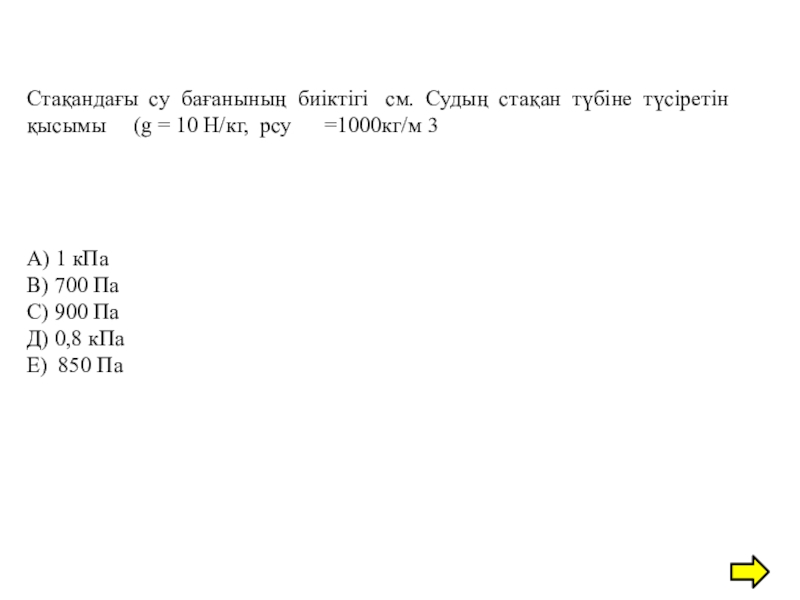 Слайд 19Стақандағы су бағанының биіктігі см. Судың стақан түбіне түсіретін